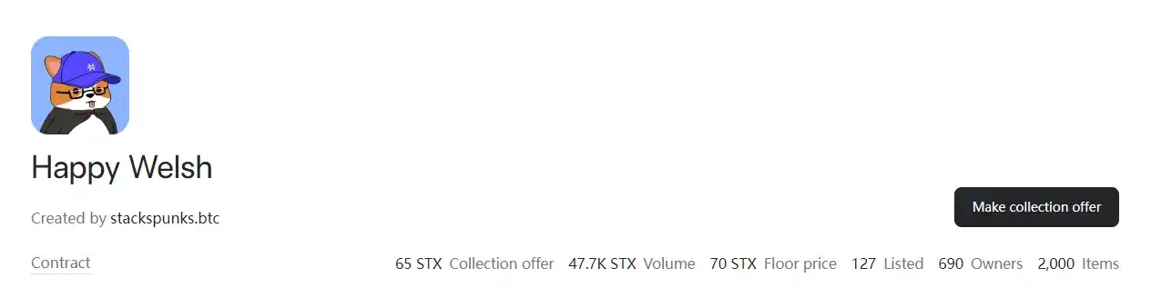 在最近的一周,Stacks 生态讨论热度最高的 NFT 项目是 Happy Welsh,其项目代币也从上半年的归零到这波行情暴涨数十倍。Happy Welsh 总量为 2000 ,地板价为 70 STX(如下图)。