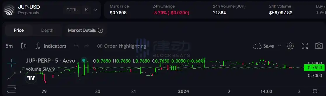 1 月 3 日,据期权交易平台 Aevo 数据,JUP 期货价格暂报 0.7608 美元,24 小时跌幅 3.79%,24 小时交易量达 56,097 美元,当前未平仓合约量为 1,421,983 美元。