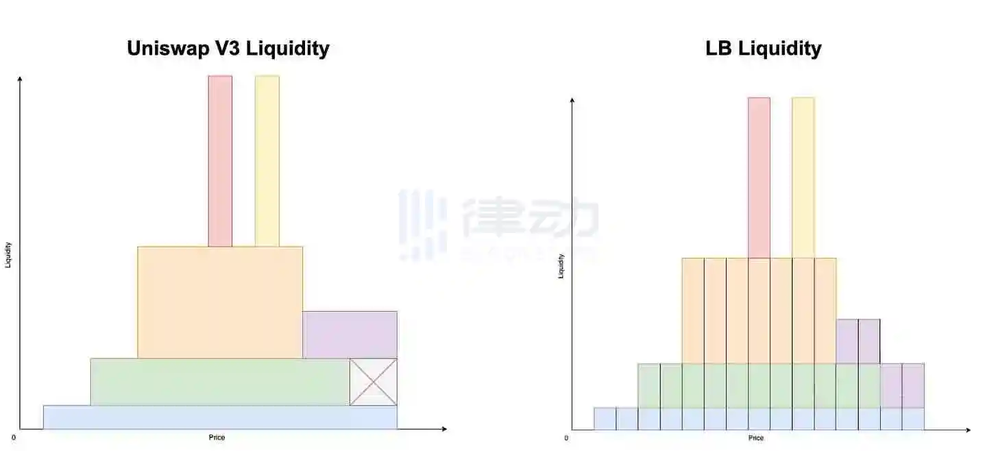 由于在 Trade Joe V2 中,流动性是通过每个 bin 垂直聚合的,而在 Uniswap V3 中,流动性是横向聚合的。垂直聚合的主要好处是它允许流动性可替代。