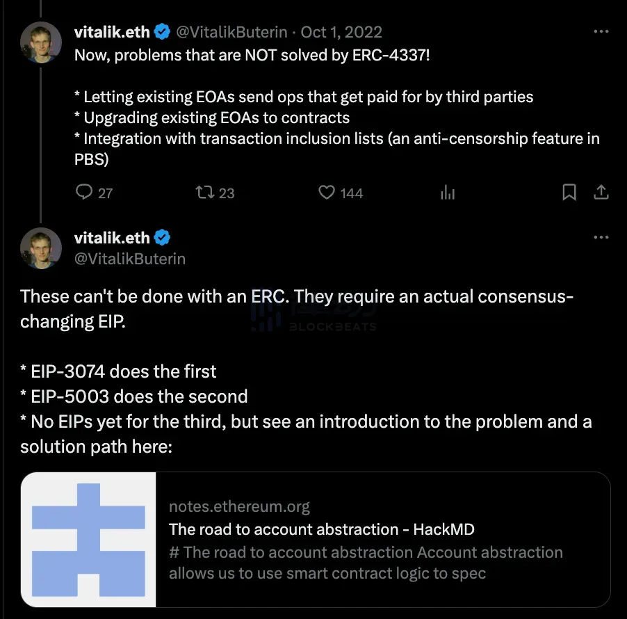 对此,以太坊社区针对以太坊路线图展开激烈讨论。加密研究员 FRANCESCO 深入讨论了其关注的 ERC 和 EIP,并分析了各提案的优势。他认为,尽管以太坊的发展通常被认为较为缓慢且受控以优先考虑安全性,但以太坊并未保持静止,其中 ERC-4337、EIP-4844、EIP-3074 和 EIP-5003 的实施在这一演进旅程中发挥了至关重要的作用。BlockBeats 将原文编译如下: