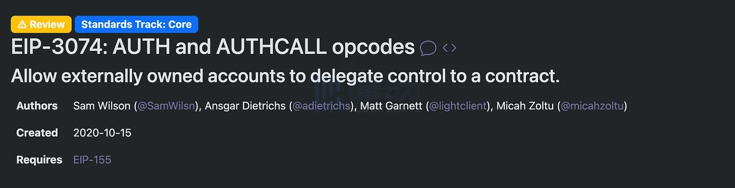 这一提案与 EIP-3074 非常搭配,后者提供了将 EAOs 签署权限委托给智能合约的「操作码」。
