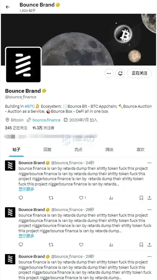 1 月 7 日,去中心化拍卖平台 Bounce Brand 官方推特账号疑似遭遇攻击,黑客频繁发布与项目无关话术。