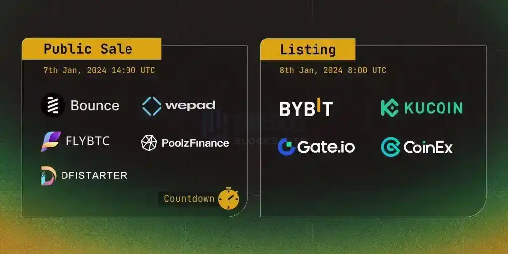 1 月 7 日,Web3「去中心化社交数据层」Port3 Network 公告,将于 2024 年 1 月 7 日 14:00(UTC 时间)在 Bounce、WePad、Flybtc、Poolz、Dfistarter 五个平台上同步进行初次 DEX Offering(IDO)。随后,于 1 月 8 日 8:00(UTC 时间)同步上线 Bybit、KuCoin、Gate、CoinEX 四个 CEX 平台
