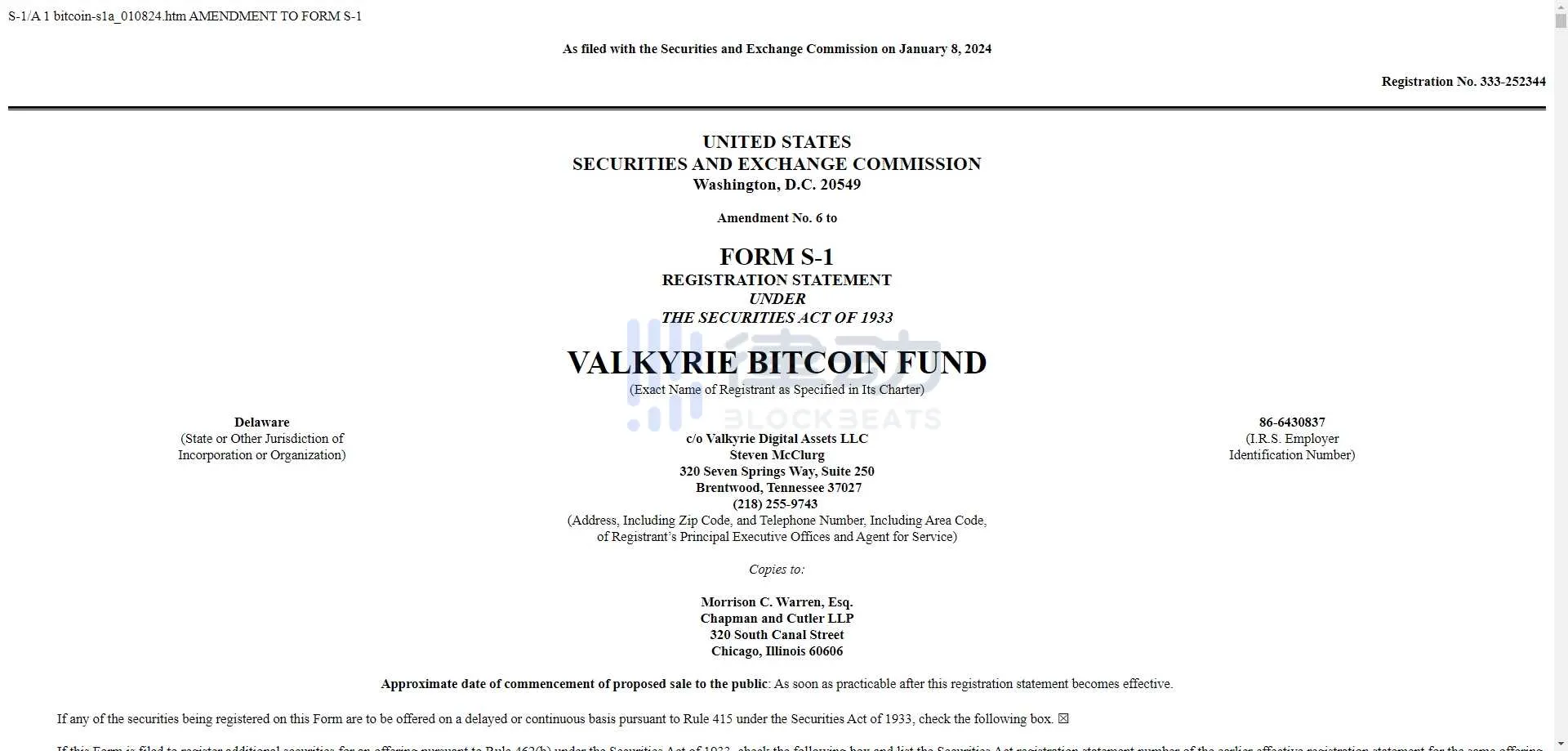 BlockBeats 消息,1 月 8 日,据 SEC 官网,Valkyrie 提交比特币现货 ETF S-1 更新文件,文件中其费用标准仍保持 0.8%。 据悉,SEC 要求 ETF 发行人在当地时间今天上午 8 点之前提交 S-1 修正案。