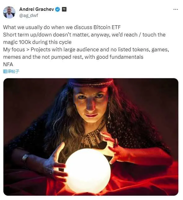 BlockBeats 消息,1 月 8 日,DWF Labs 创始人 Andrei Grachev 在其社交平台表示,近期关于 ETF 的讨论很多,但短期市场涨跌其实并不重要,坚信比特币会在本轮周期达到 10 万美元。 此外,Andrei Grachev 表示,其个人重点关注拥有大量受众且没有上市的拥有良好基本面的项目,包括游戏和 meme 币等。
