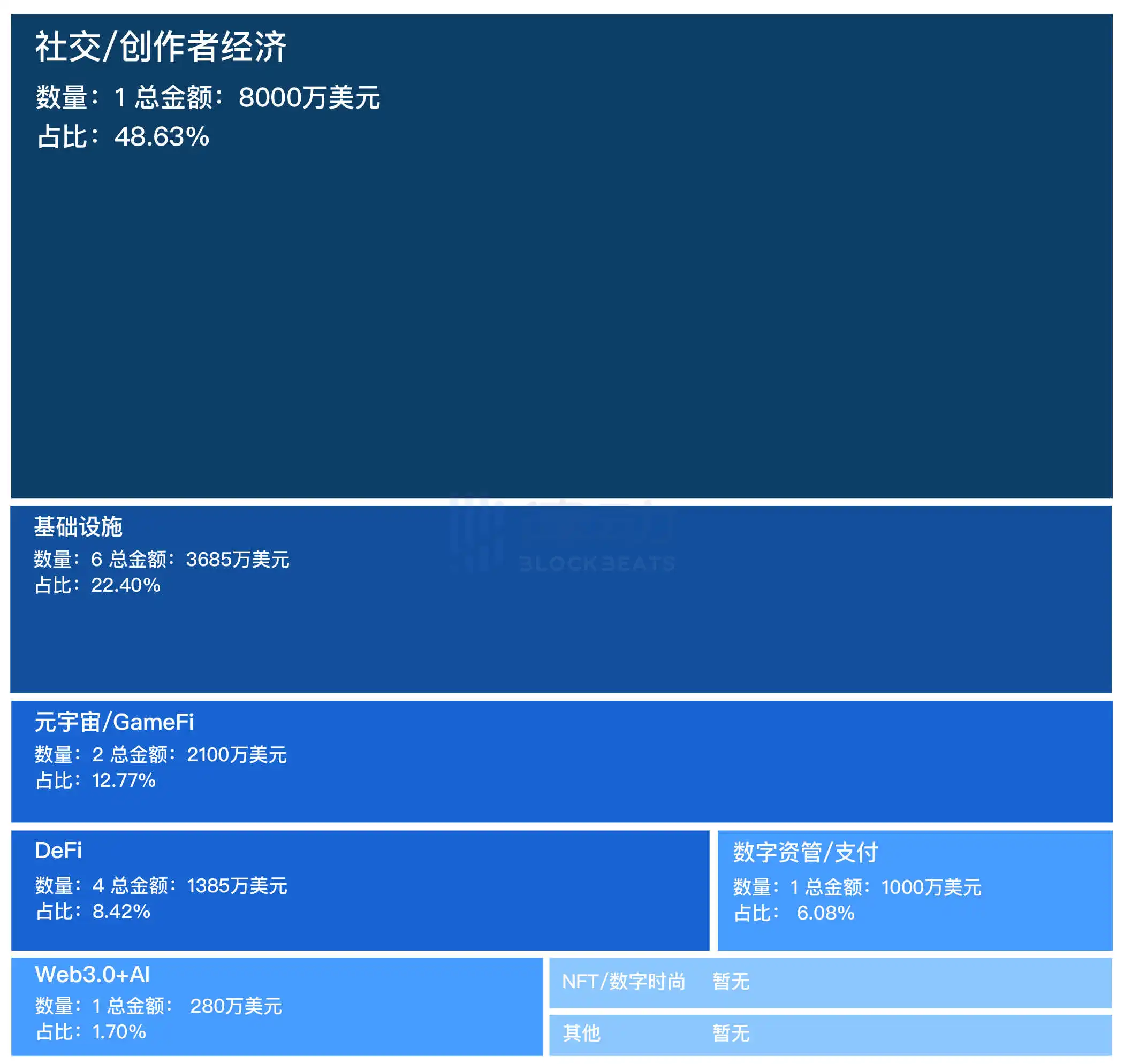 据 BlockBeats 统计,上周的融资总数为 15 笔,数量较之前增多,总金额约为 1.645 亿美元,平均融资金额为 1096.67 万美元。其中,社交/创作者经济领域占据主体,基础设施领域和元宇宙/GameFi 领域相对较多,DeFi 领域和数字资管/支付领域增多,Web3.0+AI 领域较少,NFT/数字时尚领域和其他领域融资暂无。下图为上周各板块融资占比:
