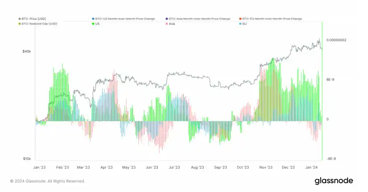 ETF 预期过后,全球购买力均大量流失。其中权重较高的美洲购买力已接近负值,亚欧购买力已流失至负值。