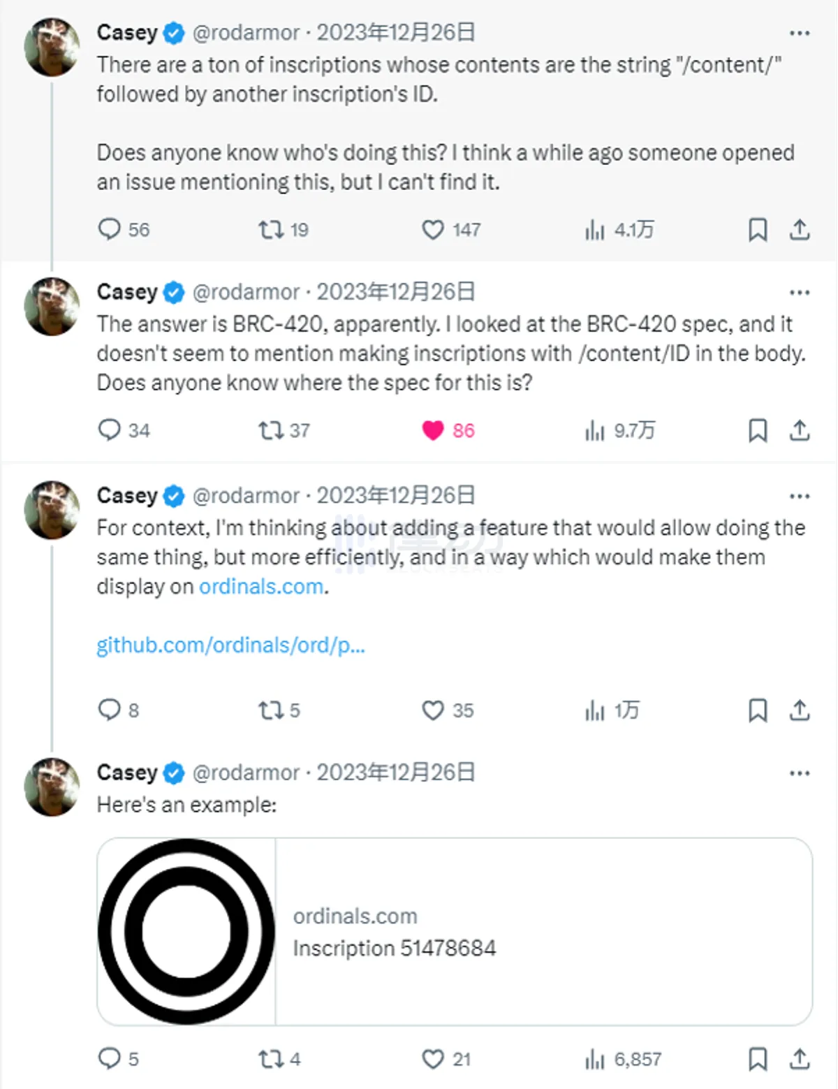 去年 12 月 26 日,Casey 发现许多铭文都以"/content/"开头,随后是另一铭文的 ID。他对此提出疑问,寻找谁在进行此类操作,并回忆起之前有人提及过这个问题。尽管一开始 Casey 在 BRC-420 规范中找不到有关这类"/content/ID"铭文的信息,但在经过社区成员和 KOL 比特里里的提示后,他找到了相关信息。这一发现激发了 Casey 的灵感,他随后创新了 delegate 字段,并将其纳入了 Ordinals 的最新升级中,该升级已经生效并在 DERP 的空投中得到应用。