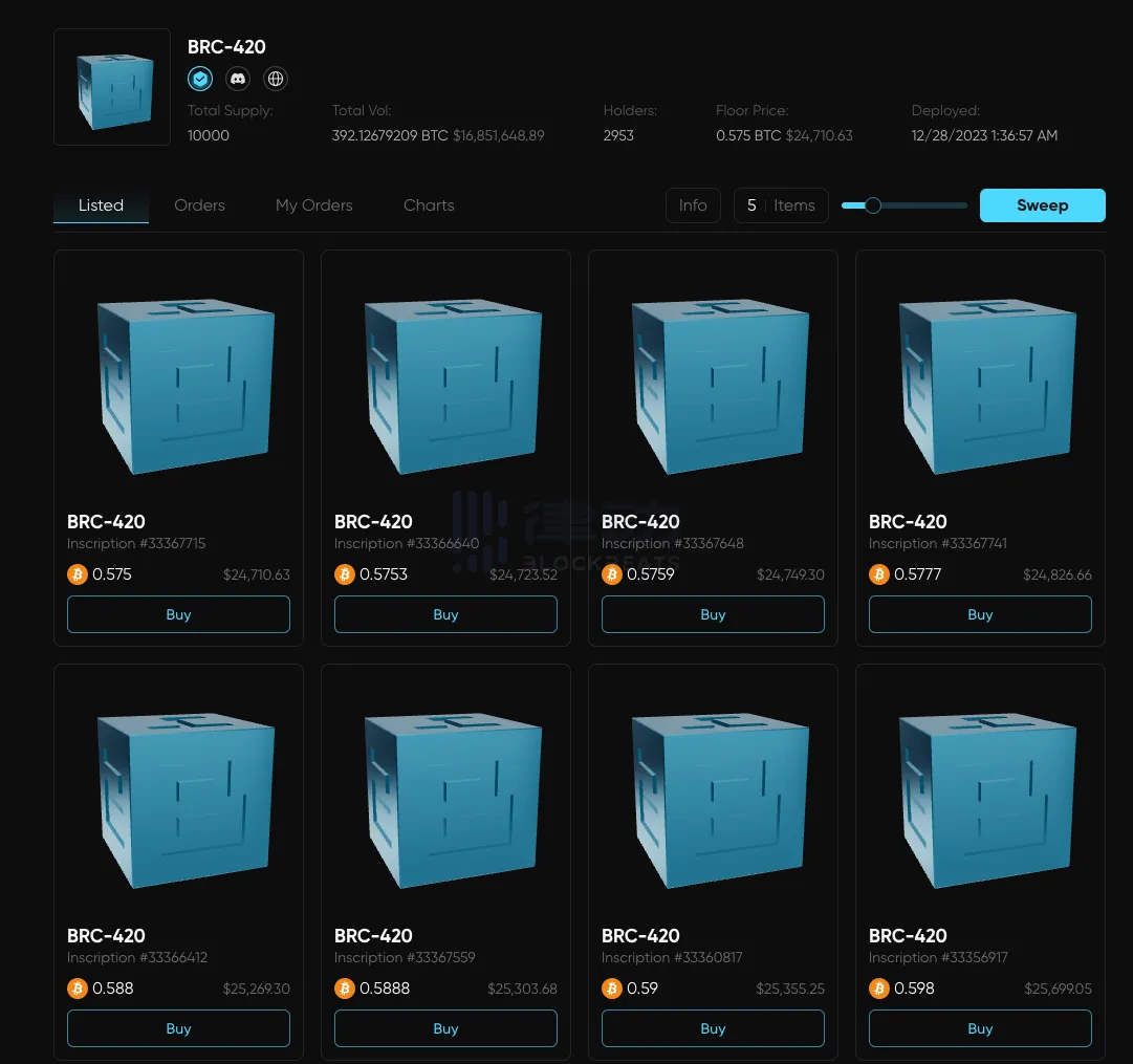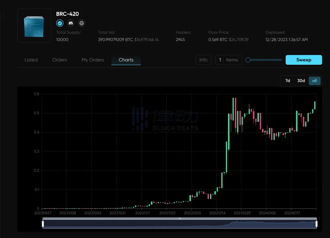 起初在 9 月,BRC-420 市值最大的资产蓝盒子的 mint 成本低到 1 刀左右,然而截止撰稿时,地板价达到了近 2.5 万刀的价格。这样的涨幅光听数字就已经很惊人了,但将其与比特币生态龙头 ORDI 做对比,会更鲜明的发现其涨幅的惊人。当时打一张 ORDI(1 张包括 1000 个币)成本在 2 到 3 美元,按 1 个 ORDI 60 美元的价格计算,目前一张的价格为 6 万美元,这是一笔超过两万倍涨幅的投资。不过 ORDI 用了将近 10 个月,而蓝盒子用了 4-5 个月。