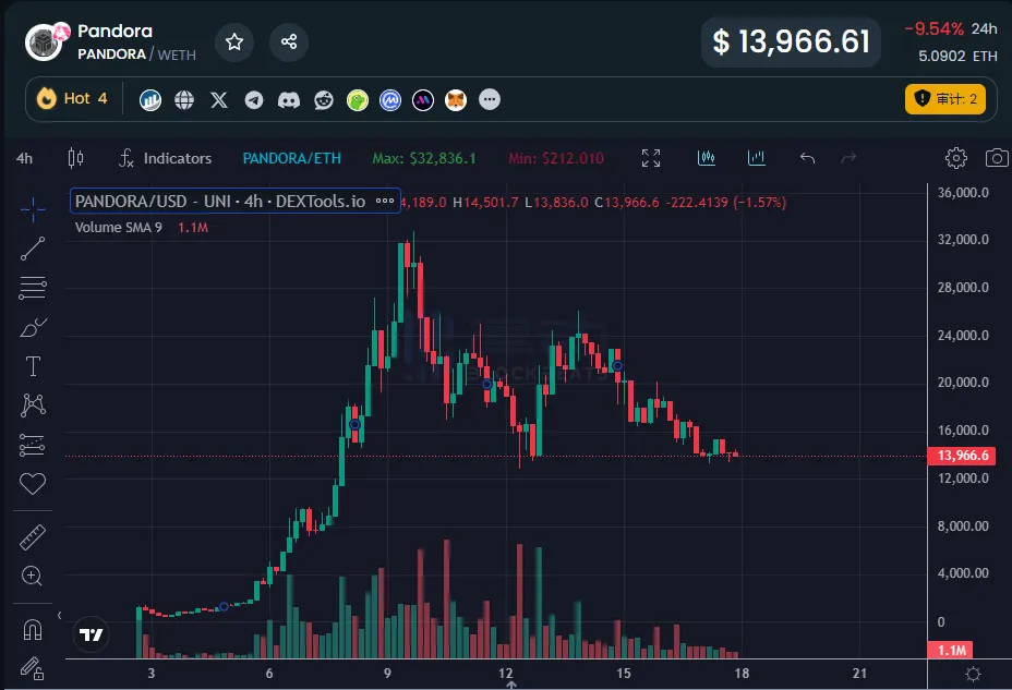 5 天涨幅超 20 倍的 ERC-404 项目 Pandora,在突破 32,000 美元后开始震荡下跌,自 2 月 10 日至 2 月 12 日,Pandora 一路降至 13,969 美元,较高点跌去超 50%。2 月 13 日,Pandora 回升至 25,000 美元,并在之后继续下跌,截止撰稿时价格为 13,966 美元。