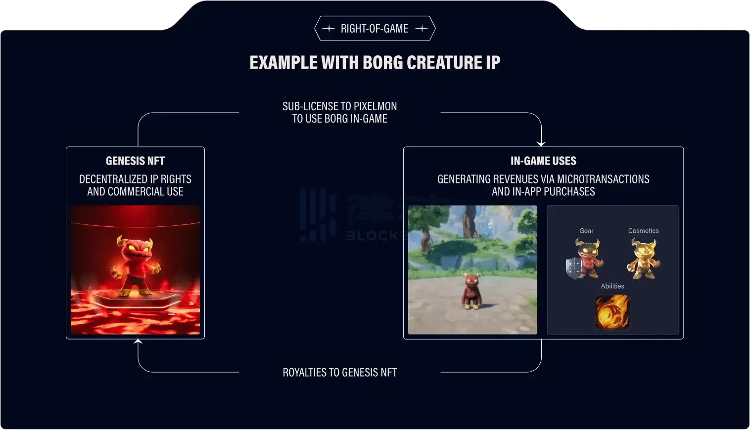 另一方面 Genesis NFT 将作为 IP 所有权、特许使用权费用(franchise)的凭证。Pixelmon 表示,通过去中心化的 IP 和特许使用权费,Genesis NFT 持有者有动力去发掘、谈判和落地 IP 的商业化应用,相应地赚取特许使用权费。