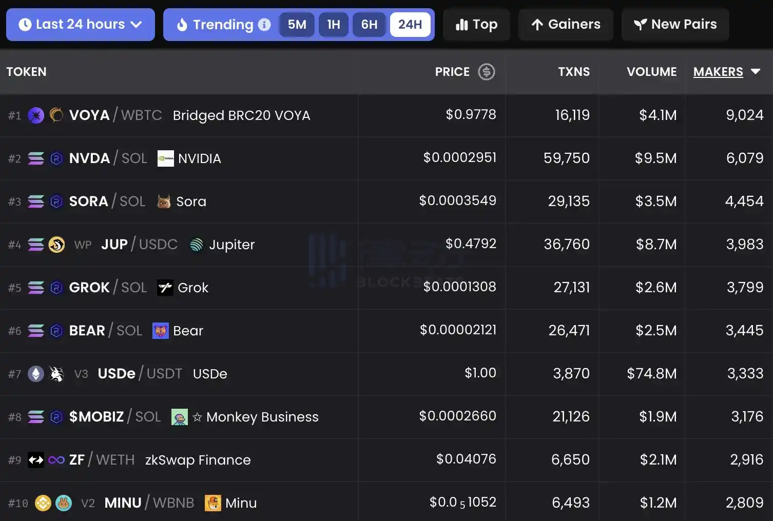 据官方消息,VOYA 作为首个在比特币原生二层网络 Merlin Chain 上公平发射的 BRC-20 代币,已有超过 10 万地址领取空投,过去 20 小时内交易量突破 400 万美元,市值超过 1000 万美元。据 DEX Screener 显示,VOYA 的交易地址数在所有 Altcoin 中位列第一,紧随其后的是 Solana 上的 NVDA、SORA 以及 JUP。