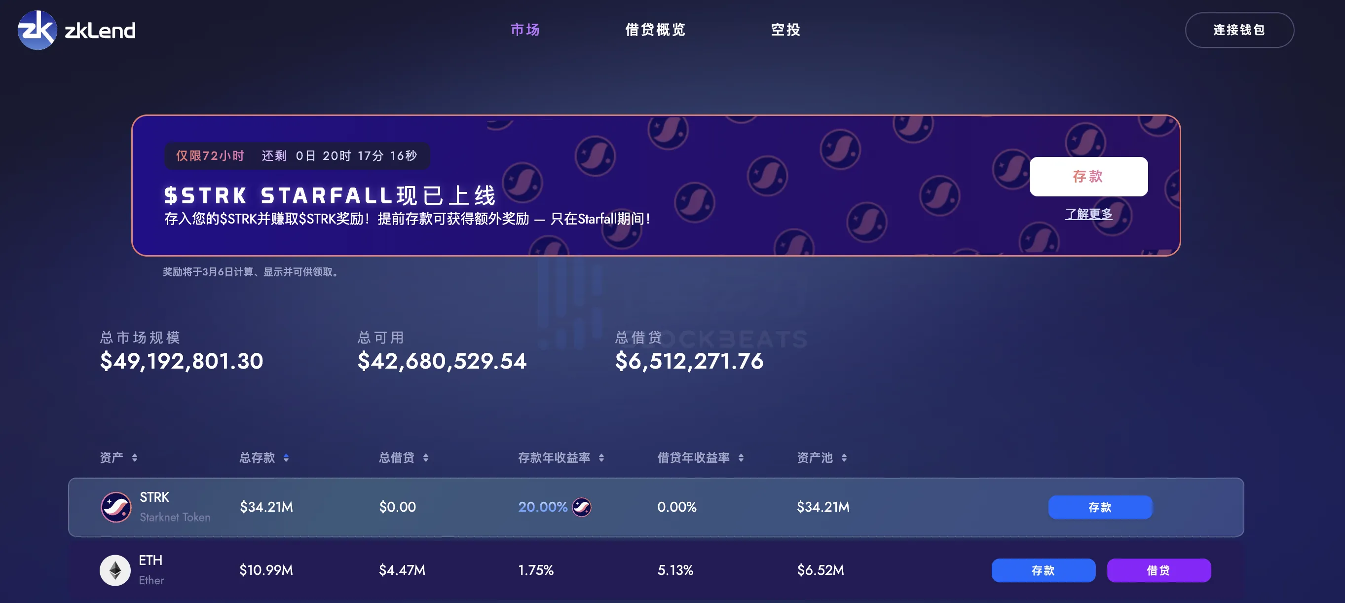 Starknet 生态 DeFi 协议 zkLend 官方表示,由于参与 STARFALL 活动用户人数持续增多,在过去的 48 小时内,平台 TVL 达到 4920 万美元,平台的 TVL 增加了 3 倍以上,平台决定延长活动时间,奖励仍然为 20% 的年化收益率。