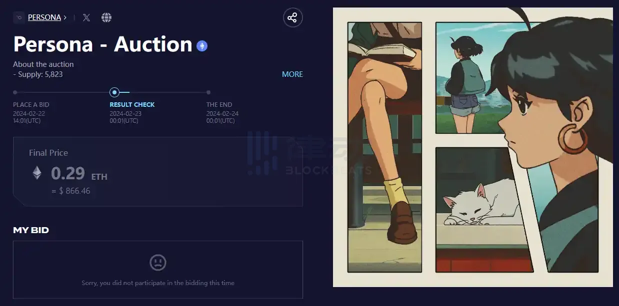 据官网信息显示,Persona 系列 NFT 最终以单枚 0.29 ETH 的上限价格结束本次公售。