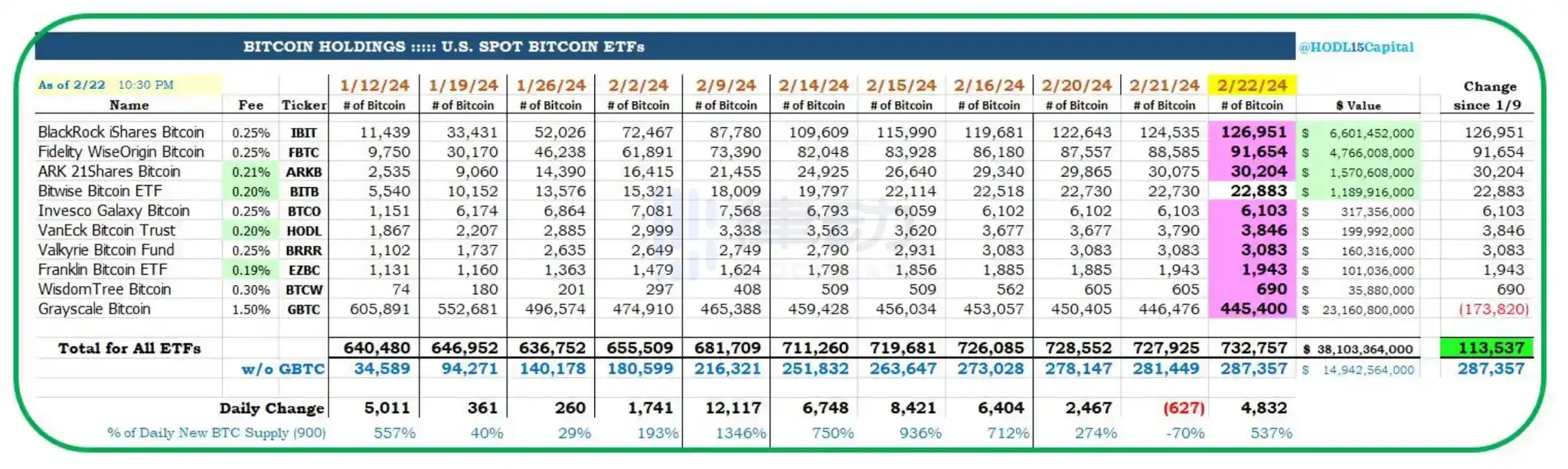 据 HODL15Capital 数据显示,9 支比特币现货 ETF 昨日净流入 4832 枚比特币。目前 9 支比特币现货 ETF 在推出后已流入 287,357 枚比特币,净流入 113,537 枚比特币。