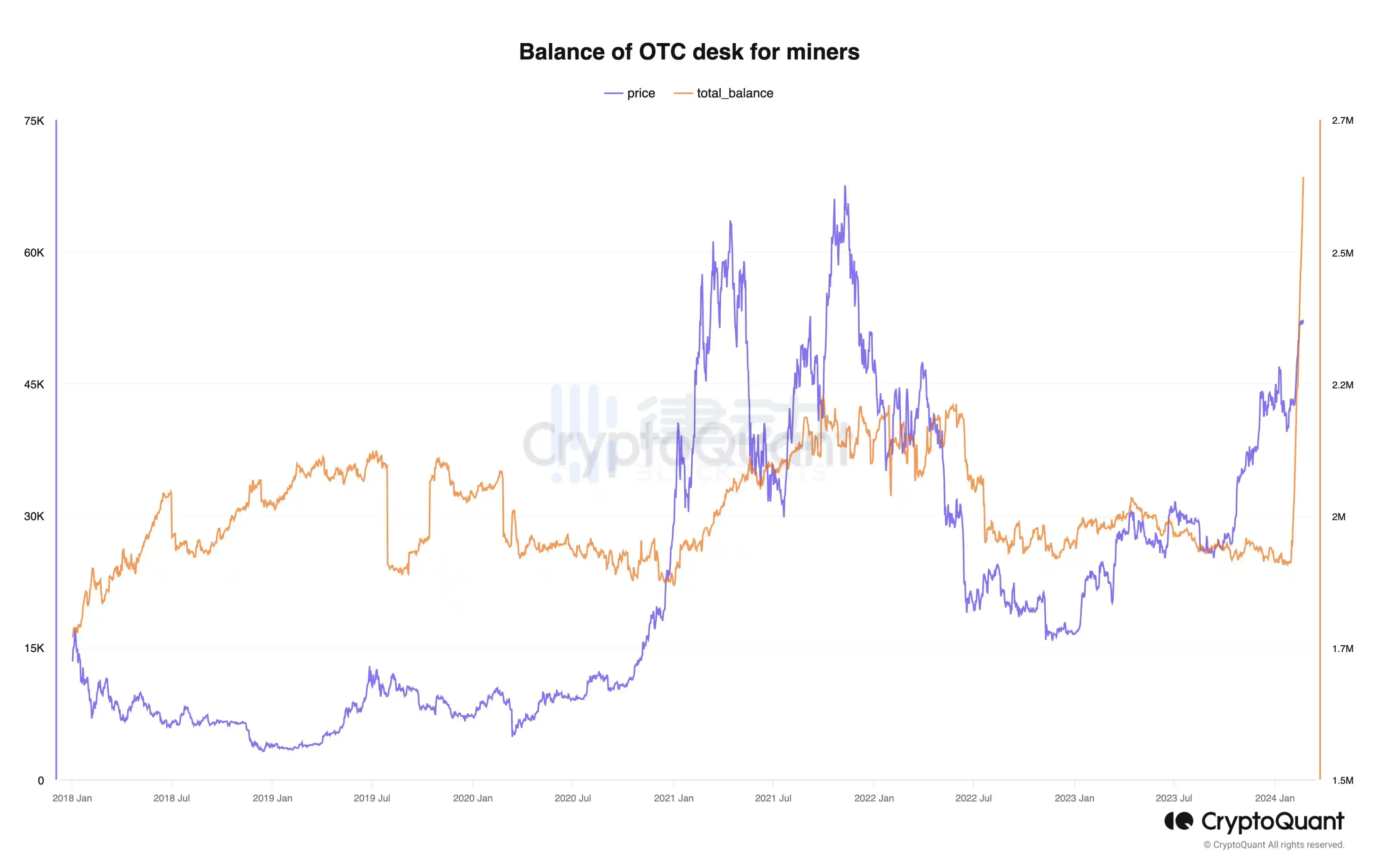 CryptoQuant 创始人 Ki Young Ju 在社交媒体上发文表示,数据显示过去 3 周已有 70 万枚 BTC 被转移至矿工使用的 OTC 平台。