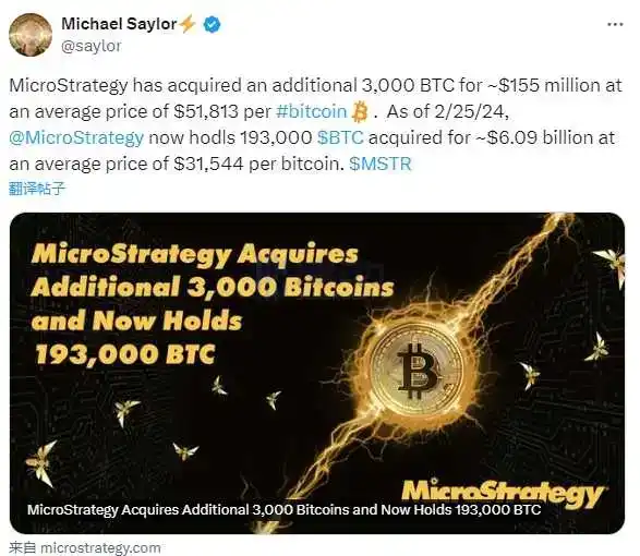 2 月 26 日,MicroStrategy 创始人 Michael Saylor 在其社交平台表示,MicroStrategy 于 2 月 15 日至 25 日买入 3,000 枚比特币,买入均价 51,813 美元。 至此,MicroStrategy 共持有 19.3 万枚比特币,持有均价约为 31,544 美元。