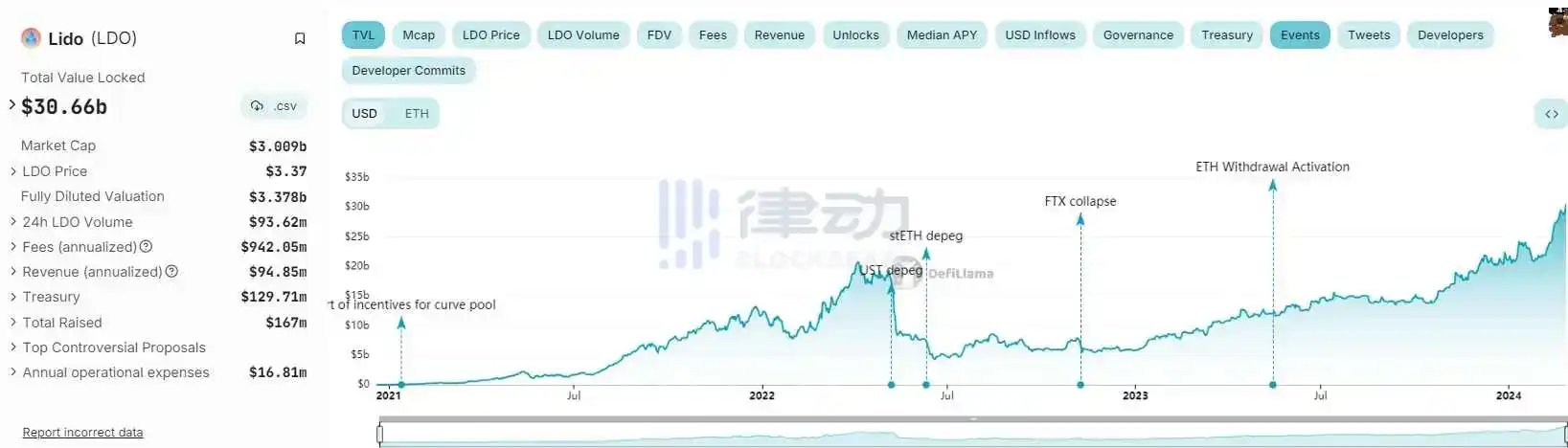 2 月 26 日,据 DefiLlama 数据,Lido TVL 达 306.6 亿美元,创历史新高。 此外,据 Dune 数据信息,当前以太坊质押率为 25.85%,其中 Lido 市占率达 31.4%。