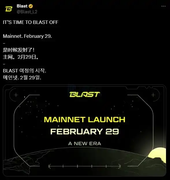 2 月 27 日,Layer2 网络 Blast 在社交平台上发文称,Blast 主网将于 2 月 29 日启动。