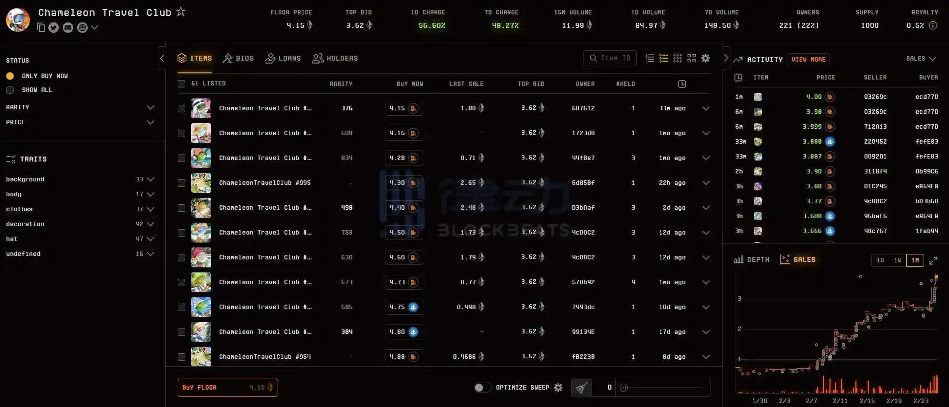Chameleon Travel Club 地板价突破 4 ETH,24 小时涨幅达 56.6%