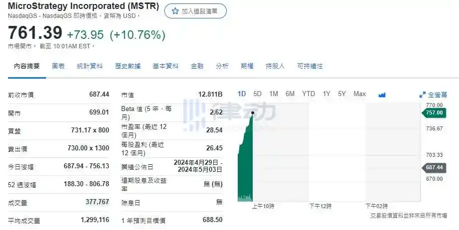 MicroStrategy 股价突破 755 美元,今日涨幅达 10.21%