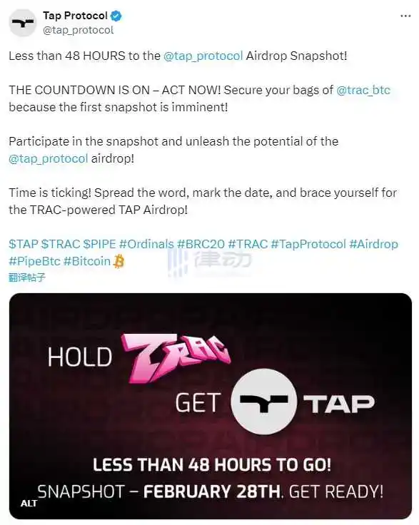 比特币 DeFi 协议 Tap Protocol 将于 28 日对 TRAC 持有者进行空投快照