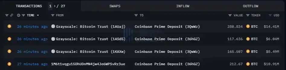 灰度向 Coinbase Prime 地址转入约 776.6 枚 BTC,约 3980 万美元