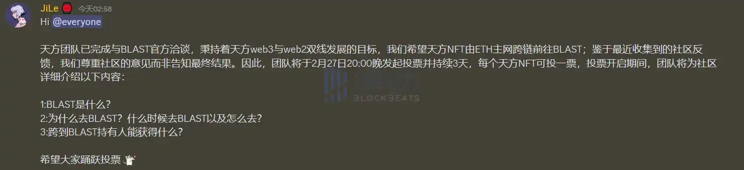 2 月 27 日,NFT 项目 TinFun 在其官方 Discord 社区表示,TinFun 团队已完成与 Blast 官方洽谈,希望 TinFun NFT 由 ETH 主网跨链前往 Blast;鉴于最近收集到的社区反馈,该项目尊重社区的意见而非告知最终结果。因此,团队将于 2 月 27 日 20:00 晚发起投票并持续 3 天,每枚 TinFun NFT 可投一票。