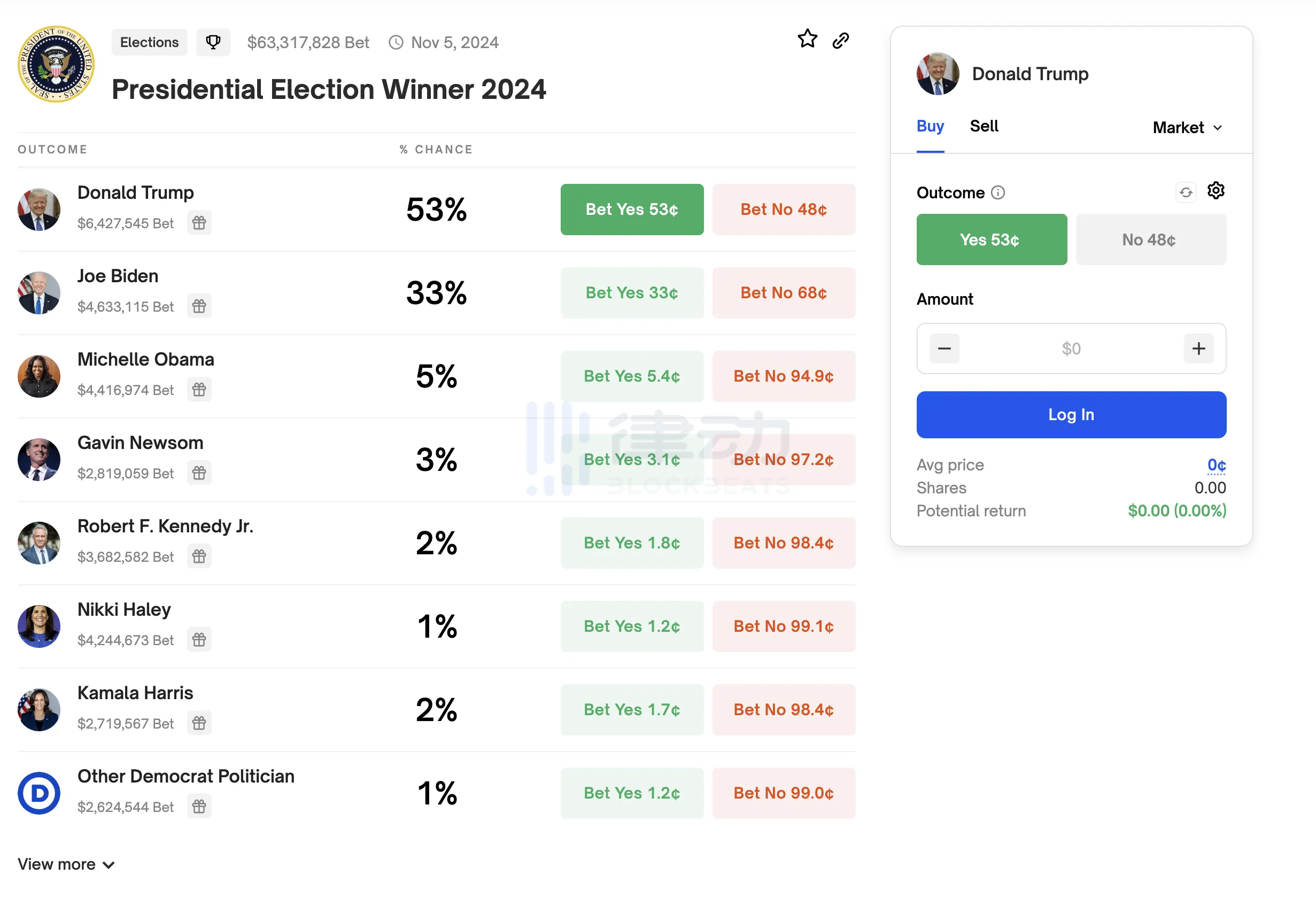 特朗普已经连续几次在其创办的媒体 Truth Social 上转发他在 Polymarket 上的赔率。截至撰稿时,此次预测的全部赌注达到了 6331 万美元。