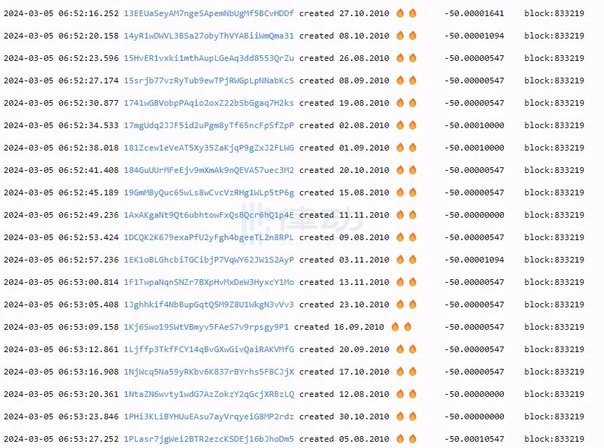 根据其地址的交易记录显示,该地址自 2010 年开始活动,经历了 14 年来的数个周期却从没有任何转出的行为,直到比特币再次触达六万九美元大关,刷新了历史最高记录,该地址才有新的活动。