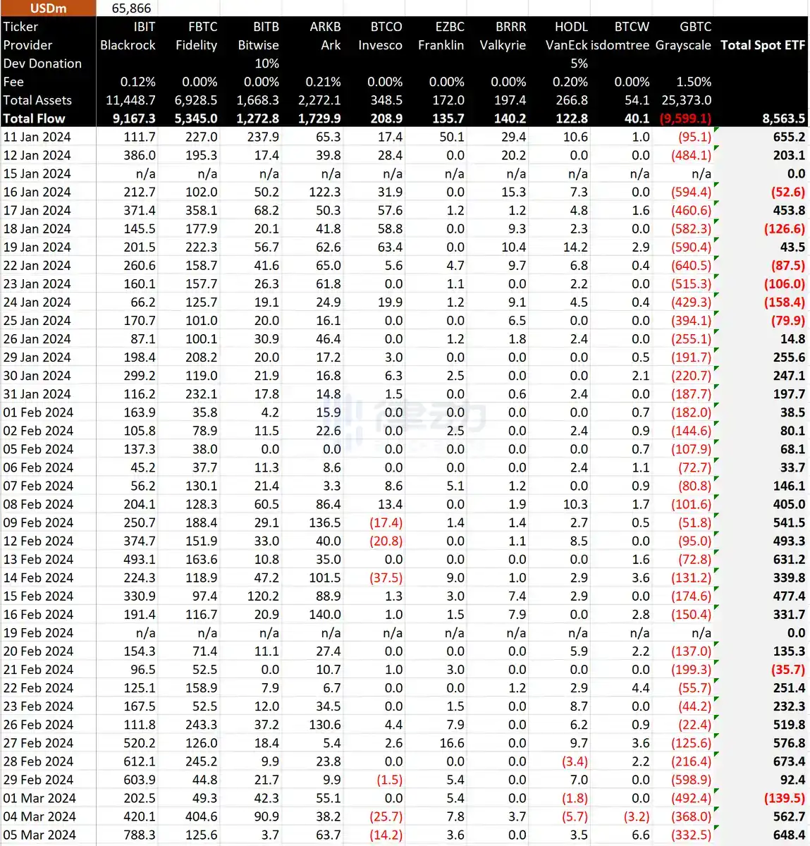 4. 比特币现货 ETF 3 月 5 日净流入 6.48 亿美元,创单日净流入新高;