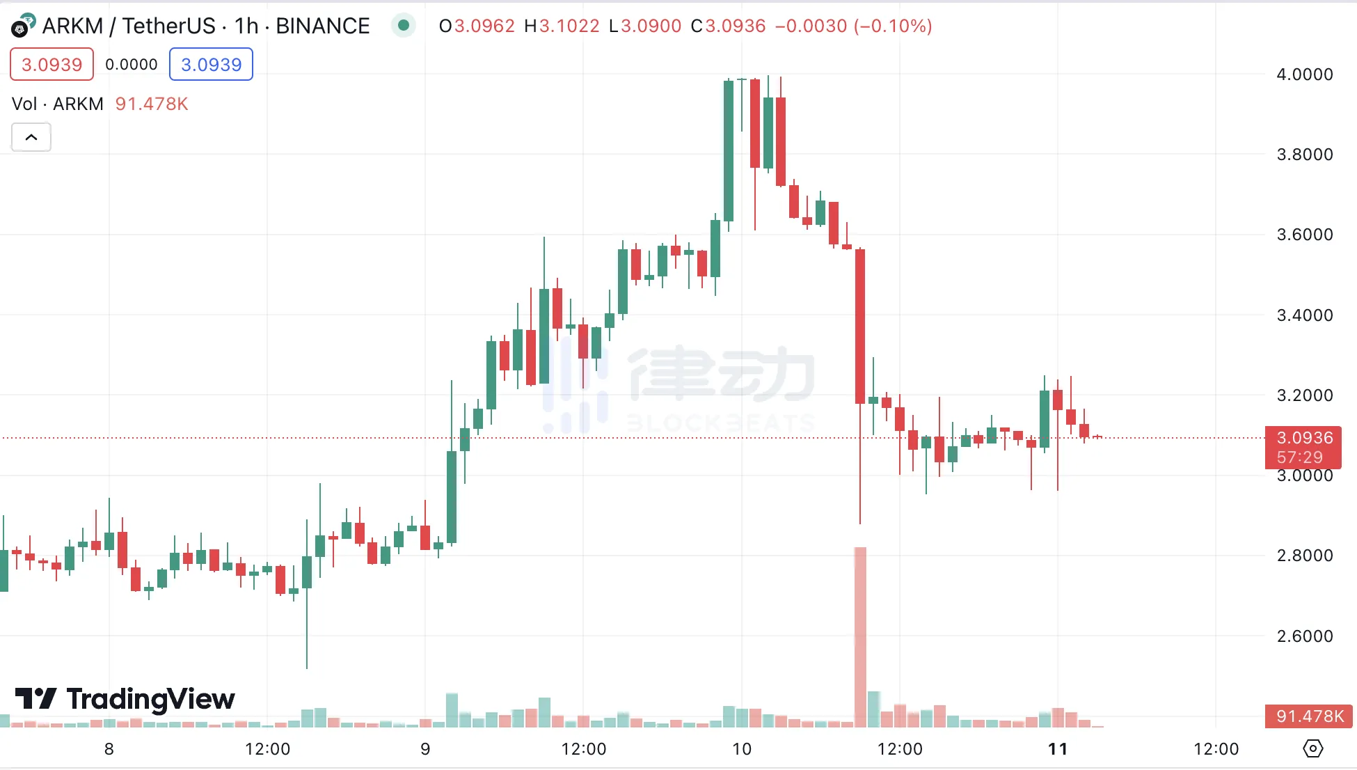 AI 驱动的数据分析平台 Arkham(ARKM)跌破 3 美元,在昨日 5 分钟内跌幅达 17.5%,现报价 3.1 美元,24 小时跌超 20%。