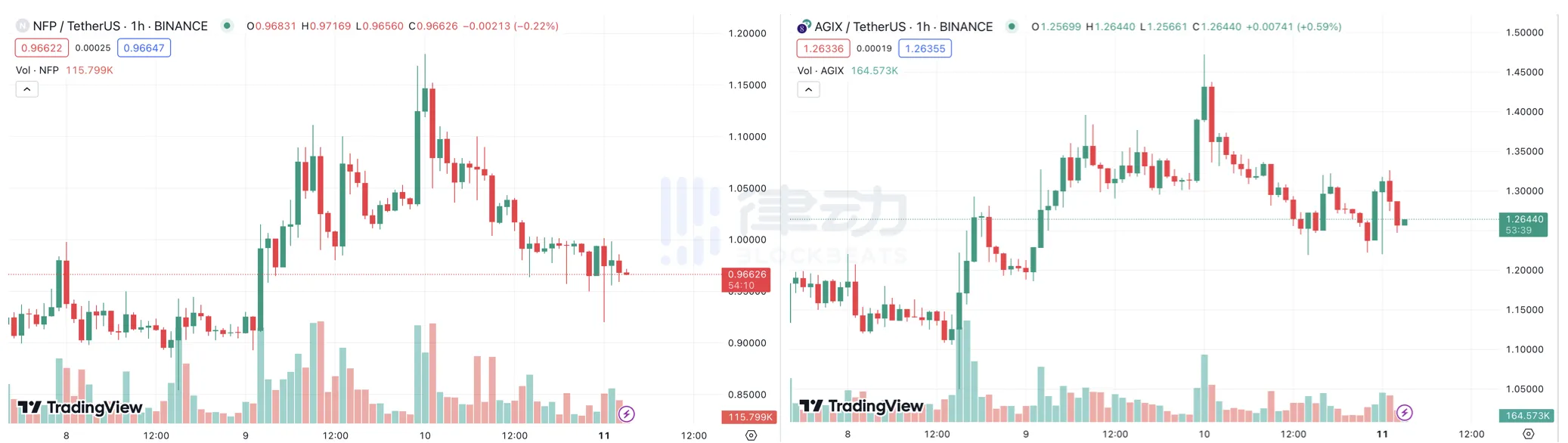 AI 驱动的 UGC 平台 NFPrompt(NFP)24 小时跌超 15% 并仍在下跌,去中心化 AI 市场 SingularityNET(AGIX)也较高点跌去了超 10%。