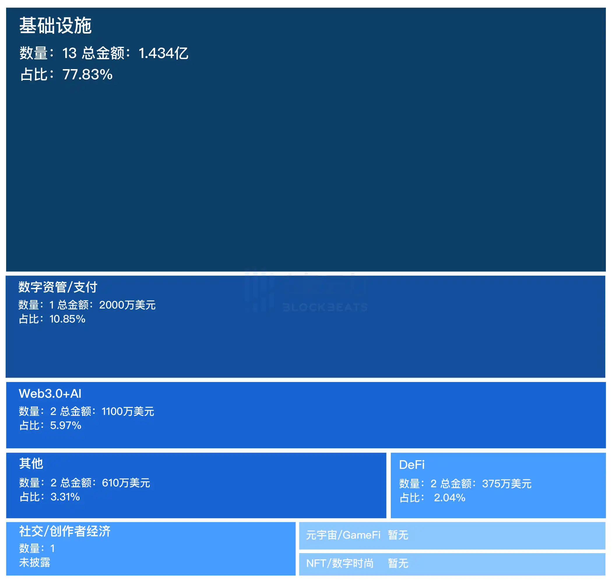 据 BlockBeats 统计,上周的融资总数为 21 笔,数量较之前减少,总金额约为 1.8425 亿美元,平均融资金额为 877.38 万美元。其中,基础设施领域占据主体,数字资管/支付领域相对较多,Web3.0+AI 领域和其他领域融资增多,DeFi 领域和社交/创作者经济领域较少,元宇宙/GameFi 领域和 NFT/数字时尚领域暂无。下图为上周各板块融资占比: