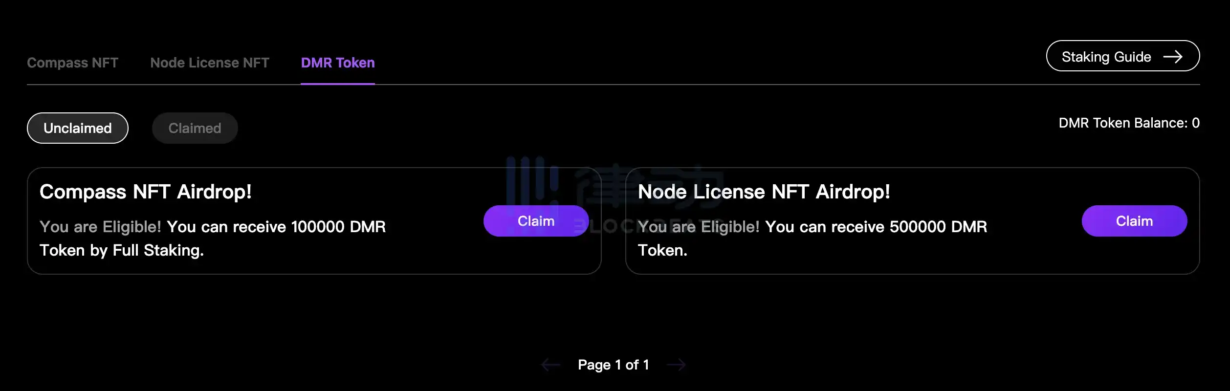 MR 基础设施 DeMR 已于北京时间 3 月 18 日 12 时(与快照时间相同)开放 DMR 代币空投领取,持有一直处于质押状态的 Compass NFT 可获得 10 万枚 DMR(若没有从头到尾进行质押,则只能获得 5 万枚 DMR),持有 Node License NFT(无需质押)可获得 50 万枚 DMR。