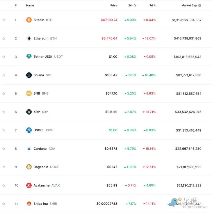 Solana 上涨 7% ,狗狗币(DOGE)、莱特币(LTC)和比特币现金(BCH)在主流山寨币中领涨,Polygon 的 Matic 代币上涨 1.5% 。