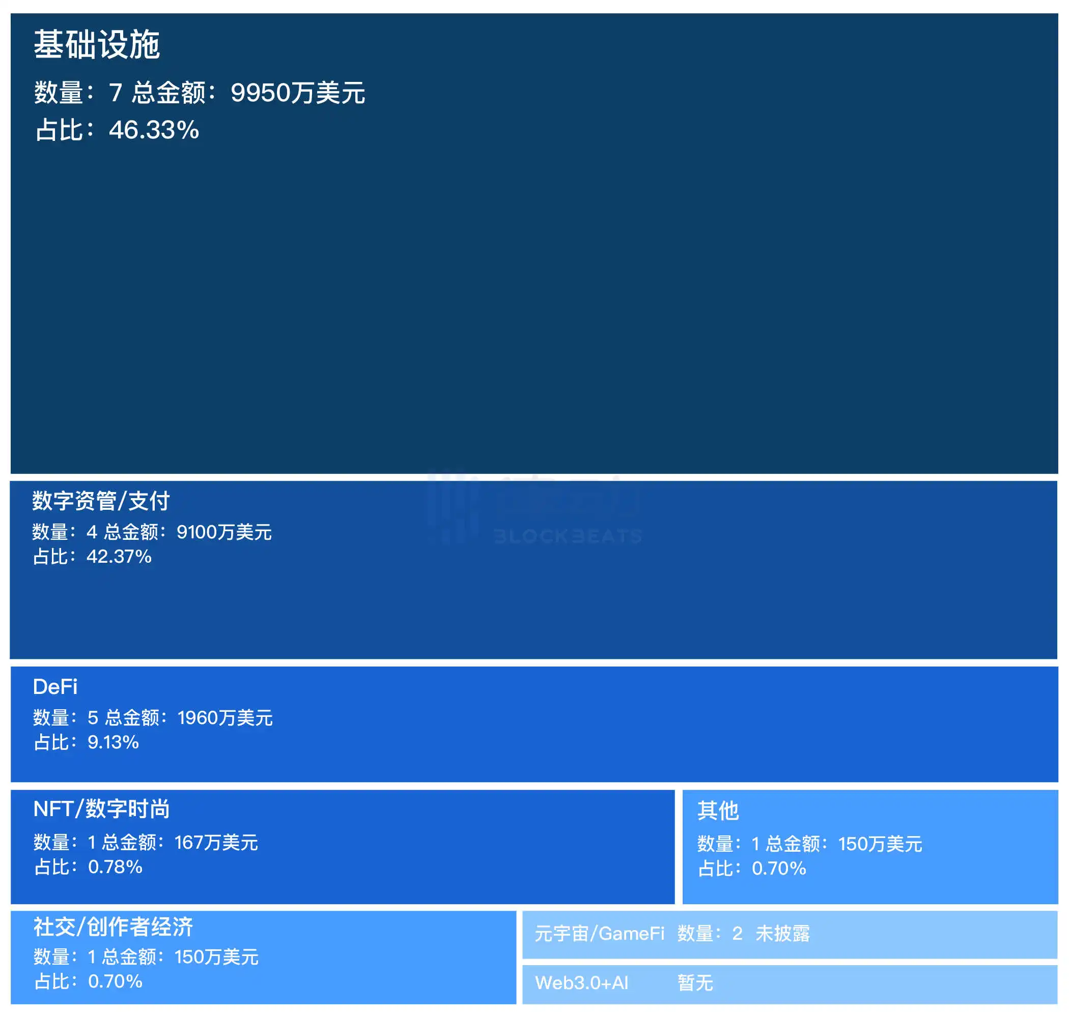 据 BlockBeats 统计,上周的融资总数为 21 笔,数量较之前增多,总金额约为 2.1477 亿美元,平均融资金额为 1022.71 万美元。其中,基础设施领域占据主体,数字资管/支付领域和 DeFi 领域相对较多,NFT/数字时尚领域、社交/创作者经济领域和其他领域融资增多,元宇宙/GameFi 领域较少,Web3.0+AI 领域暂无。下图为上周各板块融资占比:
