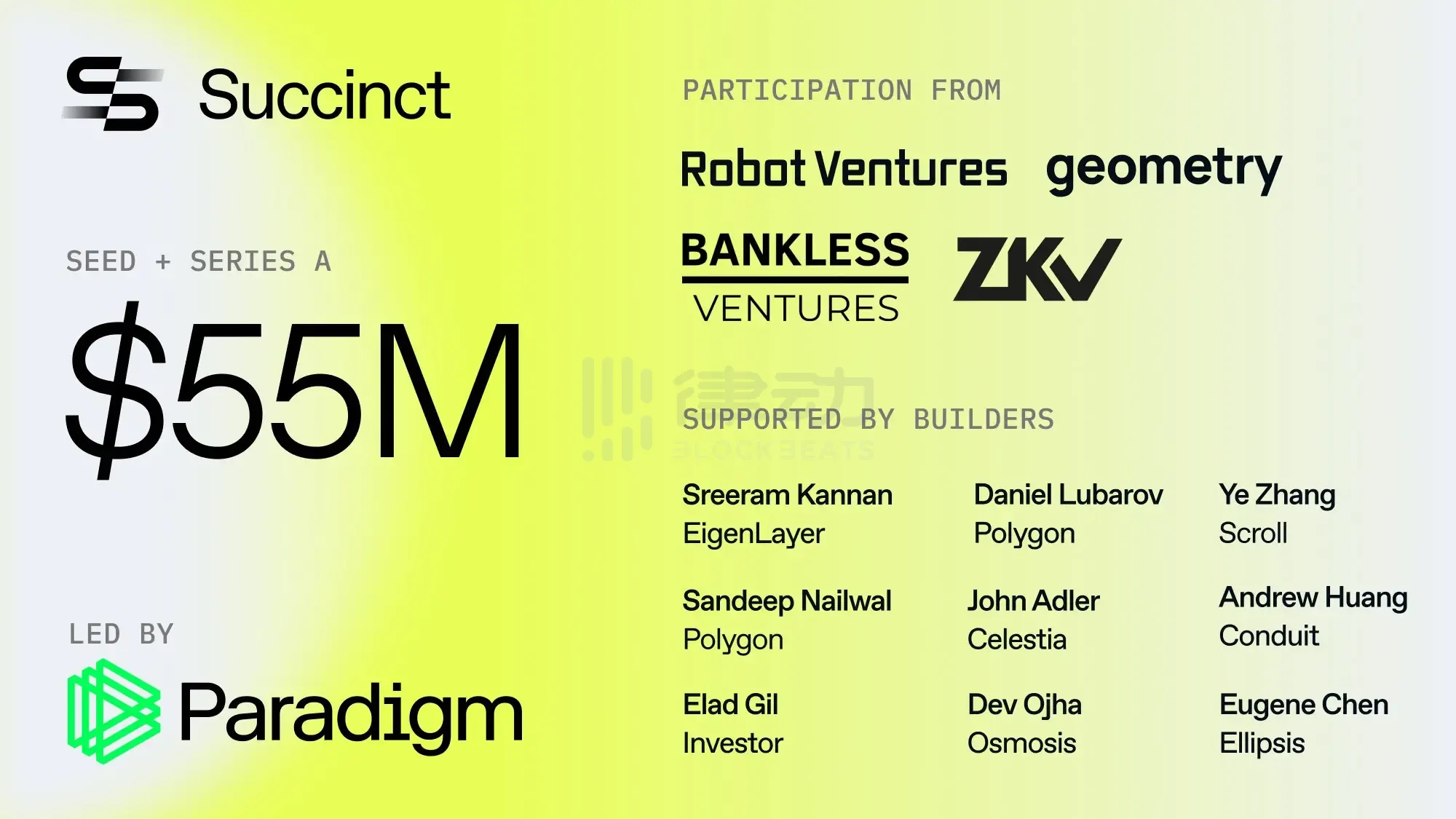 3 月 22 日,据官方消息,Web3 基础设施公司 Succinct 完成 5500 万美元融资,Paradigm 领投。参投方包括 Robot Ventures、Bankless Ventures、Geometry、ZK Validator 以及天使投资人,包括来自 Eigenlayer 的 Sreeram Kannan、来自 Polygon 的 Sandeep Nailwal 和 Daniel Lubarov 以及 Elad Gil。