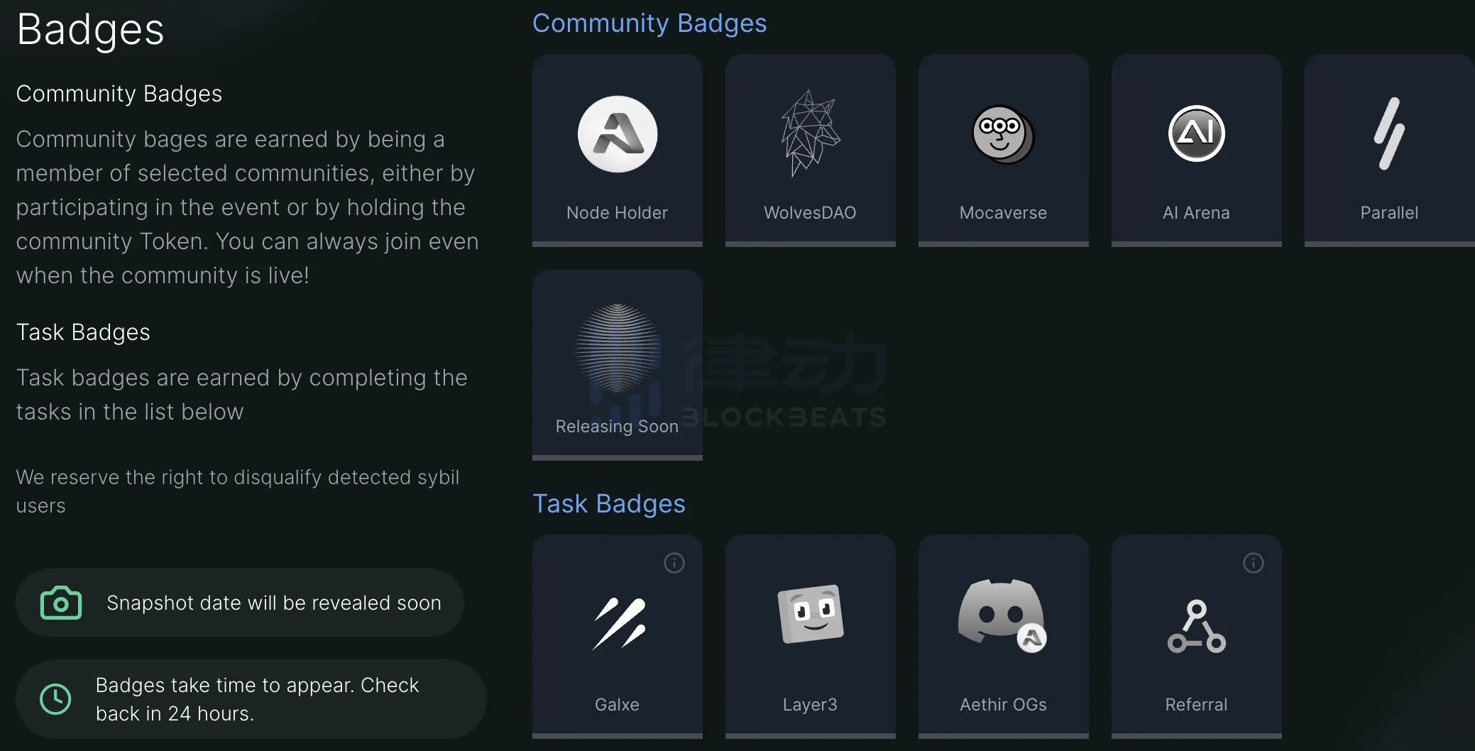AI 热度起起落落间,还未发币的 Aethir 靠售卖节点和硬件设备完成了第一波积累,蓄势待发。4 月 25 日,去中心化云计算基础设施项目 Aethir 开启了面向社区的赚积分得空投活动,用户可以通过购买节点、完成 Galxy 任务来获得积分和徽章,截至撰稿时共有超 15 万个用户参与任务,本次活动将于 5 月 12 日结束。