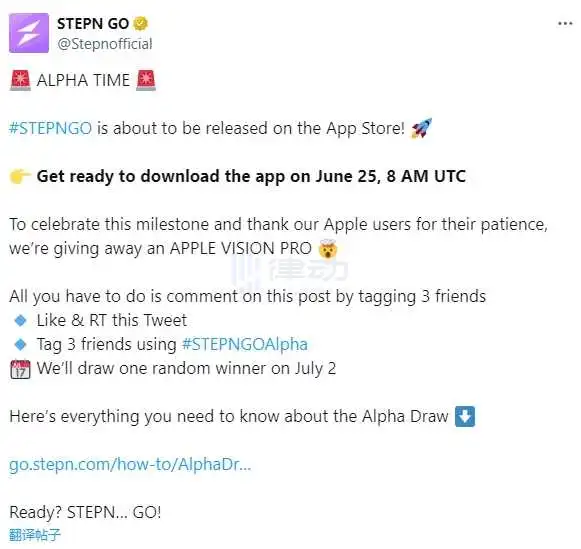 BlockBeats 消息,6 月 24 日,社交健身应用 STEPN GO 宣布其应用程序将在苹果 App Store 应用商店上线,用户预计可在 6 月 25 日 16:00 下载。