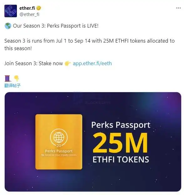 ether.fi:第三季Perks Passport已上线,本季将分配2500万枚ETHFI