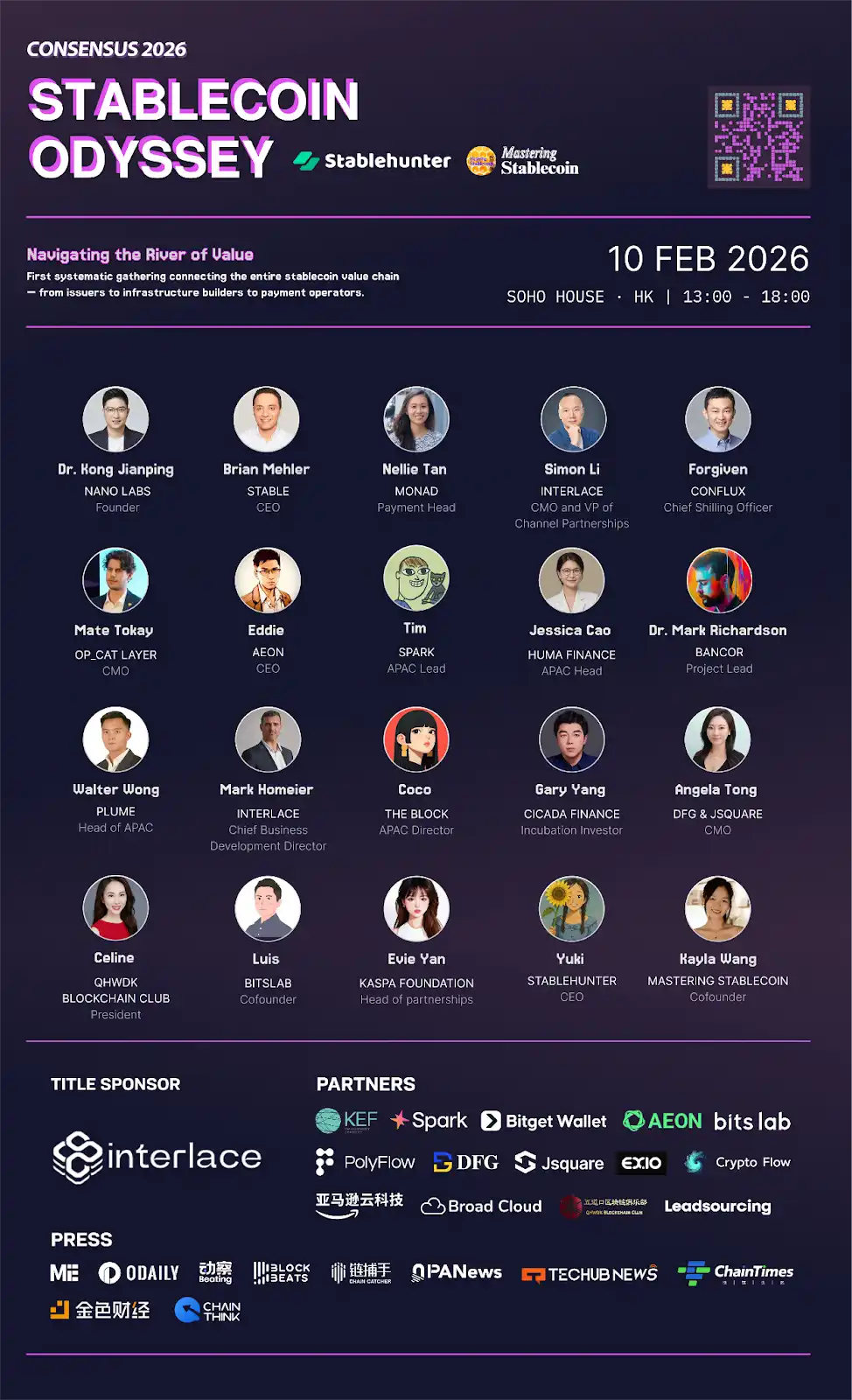 本次活动正值 2026 Consensus Hong Kong 周期间,吸引了大量国际投资者、项目方和行业建设者齐聚香港。目前活动报名人数已达 750 人,Stablecoin Odyssey 将成为这一周中最聚焦产业链协同的深度活动。