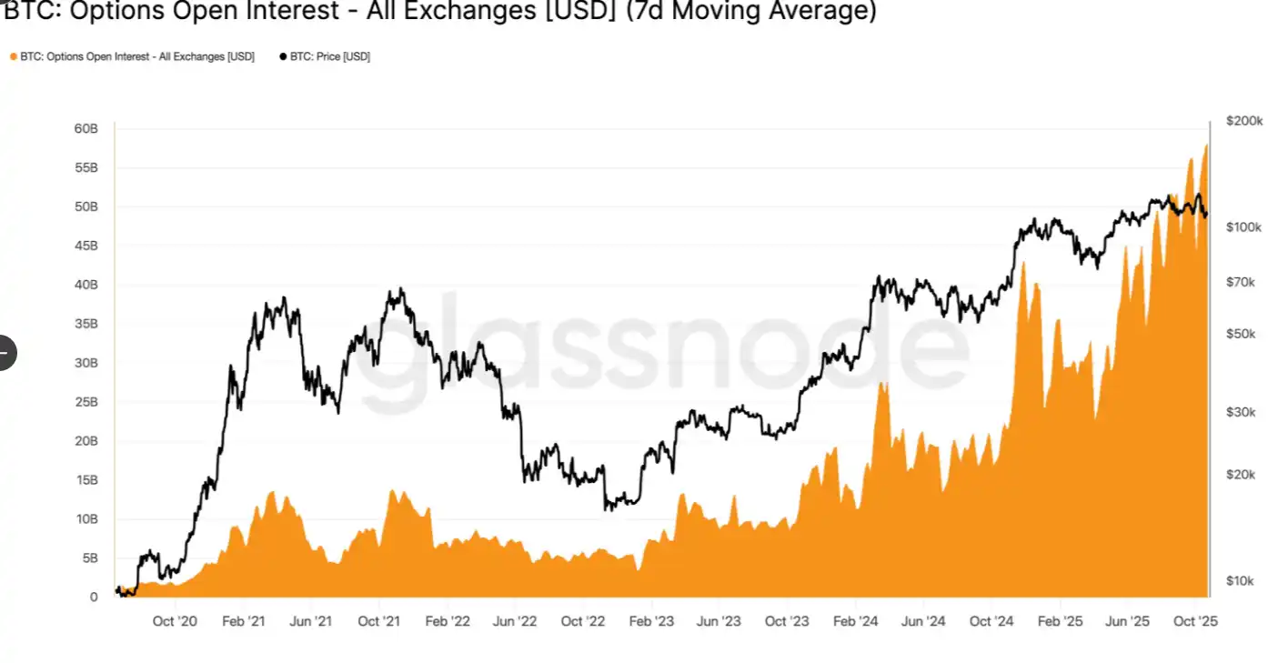 BlockBeats News, October 22, glassnode published an analysis stating that the Bitcoin derivatives market landscape is changing, with options open interest (OI) beginning to rival that of futures. The market is shifting towards limited-risk and volatility strategies, indicating that options fund flows—rather than futures liquidations—are becoming a more significant force influencing price movements.