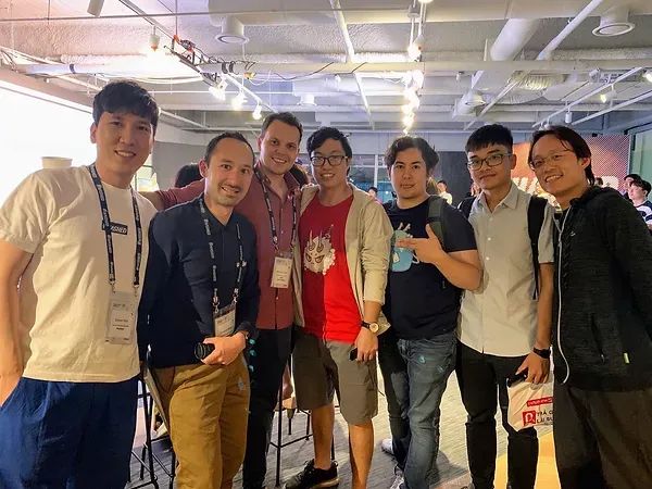 Animoca is pictured with The founding team of Axie, The founding team of The Sandbox, and Hashed's Simon Kim in 2019