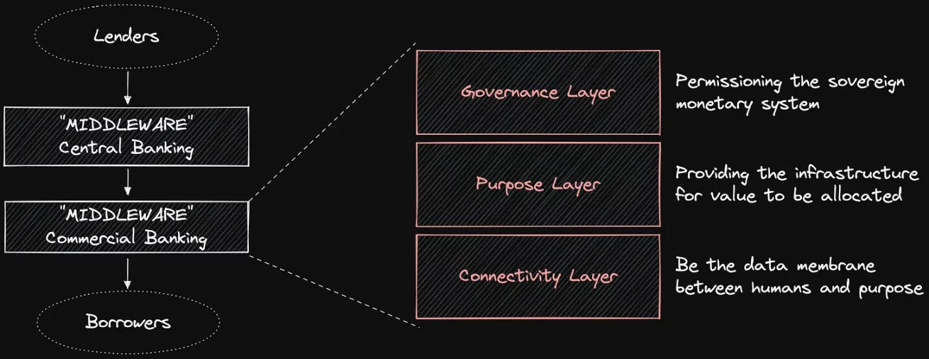 Currency middleware can be broken down philosophically into a composition of three different layers: Governance- In which to decide what can come and interact with the middleware, the purpose - representing the infrastructure through which value is managed, and the connection - forming the front end that connects the user and the infrastructure.