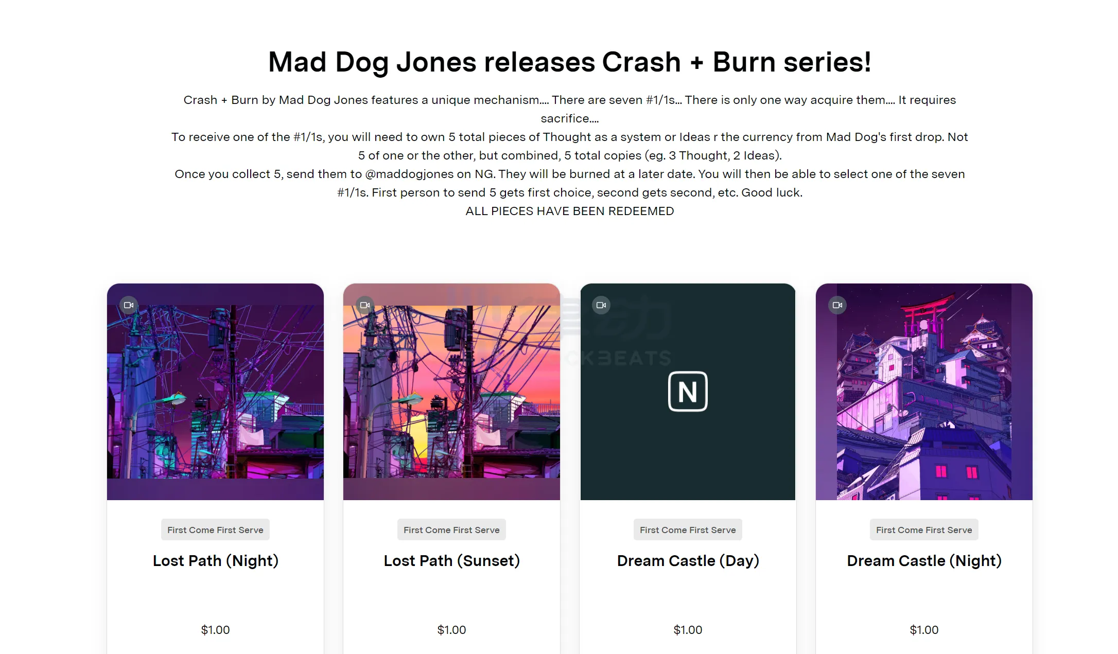 In January 2021, @Mad_Dog_Jones launched the "Crash + Burn" NFT line, a project that was a precursor to NFT Burn-Redeem. The "Crash + Burn" NFT series consists of 7 1/1 art pieces, Burn@mad_dog_jones' first NFT series to get the subscription rights to the 7 1/1 art pieces.