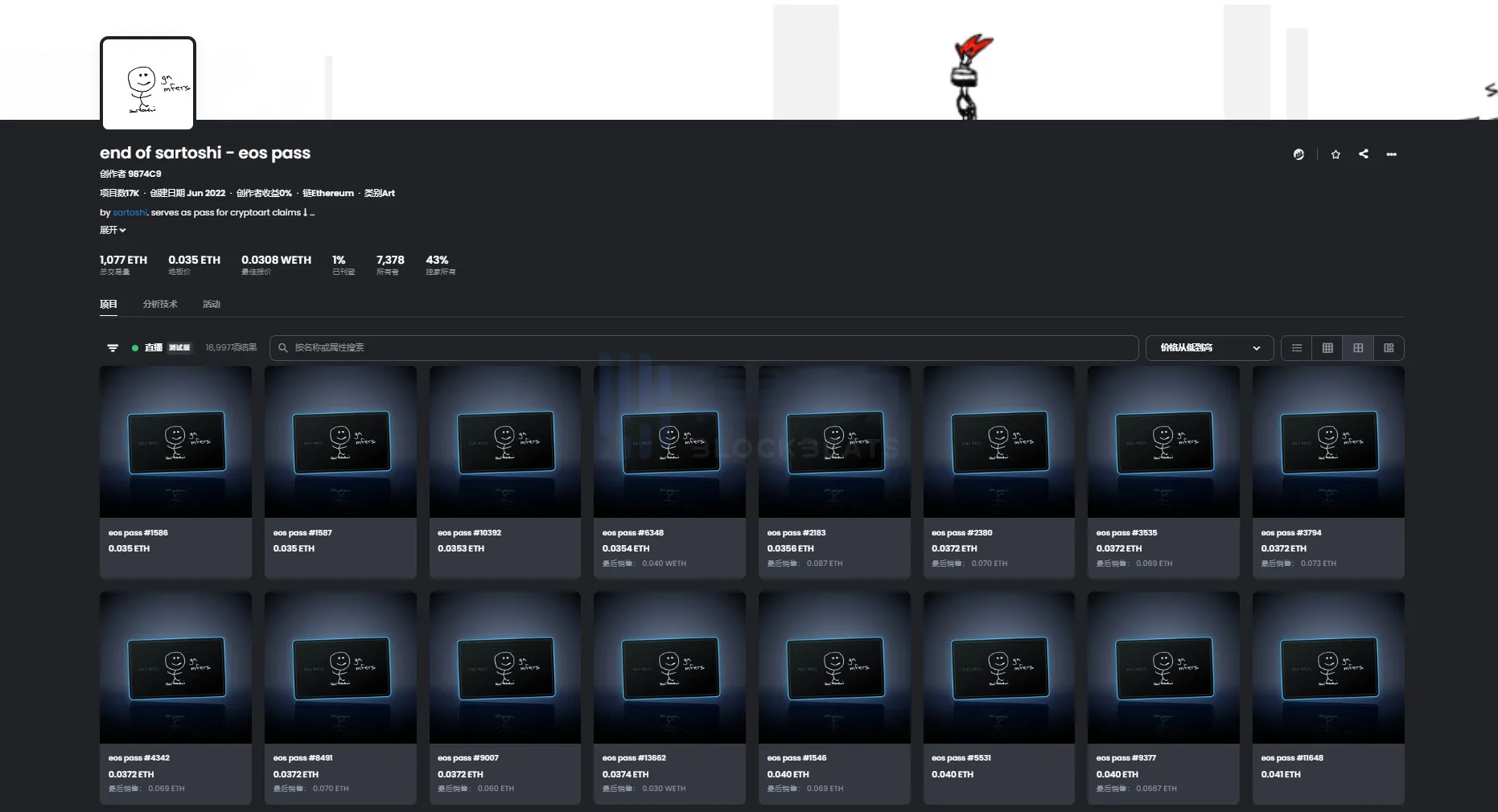 In addition to turning art NFT into a "currency", another "art gamification" must be mentioned is "lottery ticket". Compared with "currency", the successful creation of "lottery ticket" often requires the creator itself to have a greater influence to provide the expected value. For example, the "end of sartoshi" NFT series was released when mfer founder sartoshi last announced his "retirement". Although Sartoshi claimed at the time that it was only a "retirement souvenir", NFT players felt that there would be "empowers" in the future. Nearly 17,000 copies were sold for 0.069 ETH.