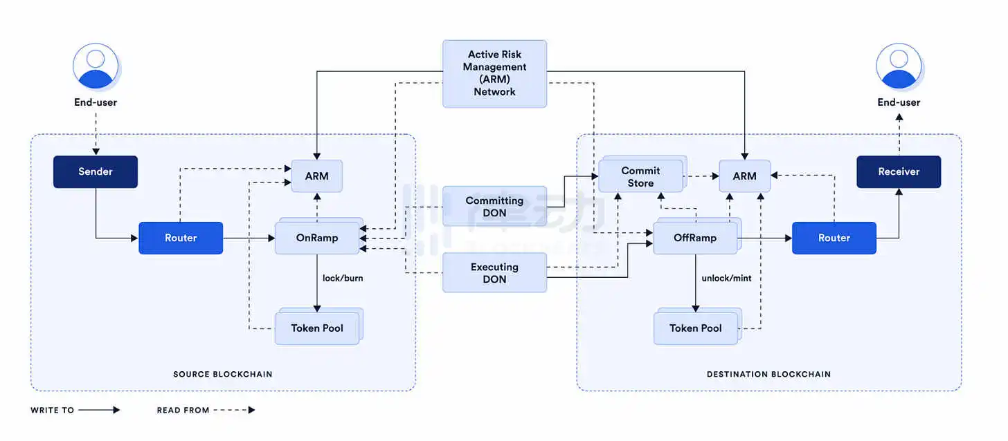 The overall architecture is divided into two parts: off-chain and on-chain. Off-chain uses Chainlink's DON node network to submit and verify Merkel Proofs for cross-chain transactions, ensuring the finality of transactions on the original chain and meeting the risk control requirements of active risk control nodes (ARM) for cross-chain transactions.