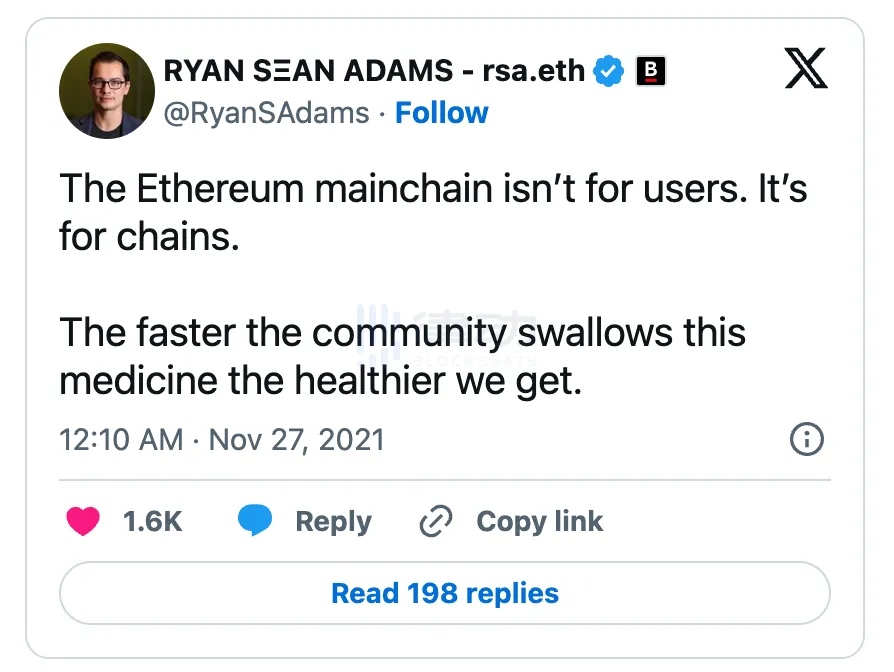 Ethereum's future will not only exist as a chain or L1, but as a highly secure DA layer and consensus layer solution. As Bankless founder Ryan said, "The Ethereum main chain is not for users, but for the chain," specifically for different Rollups and Raas platforms.