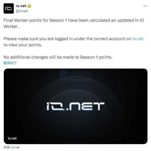 On May 13, Solana Ecosystem DePIN Protocol io.net stated on its social platform that the final points for Season 1 have been updated and users can check them on the IO Worker page. At the same time, the project party stated that no other changes will be made to the points for Season 1.